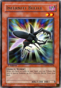 While you have no cards in your hand, you can Tribute this card to Special Summon up to 2 "Infernity Beetle" from your Deck.