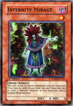 This card cannot be Special Summoned from the Graveyard. If you have no cards in your hand, you can Tribute this card to select 2 "Infernity" monsters in your Graveyard. Special Summon those monsters.