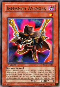 Se não tiver cartas na sua mão e quando um monstro que você controla, exceto "Infernity Avenger", é destruído em batalha e enviado ao seu Cemitério, você pode Special Summon esta carta do seu Cemitério para o seu lado do campo. Se o fizer, o Nível desta carta torna-se igual ao Nível do monstro destruído.