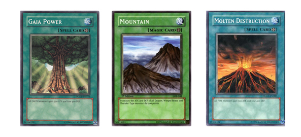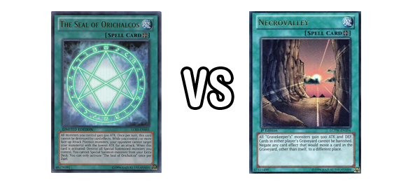 Aumentar o Atk dos monstros é sempre importante mesmo que hoje em dia a estratégia seja diferente de antigamente onde ganhava quem colocava o monstro mais forte no campo. Para isso eram usados cartas como Mage Power, Axe of Despair, United we Stand e os campos especifícos de cada tipo ou atributo de Monstro como Gaia Power, Mountain e Molten Destruction. Realmente não compensa colocar 3 cópias de Molten Destrucion por exemplo para dar +500 de ATK para os seus monstros de Fogo, mas vale muito a pena se além de dar Boost no Atk o Field Spell Card tiver além disso outros efeitos que beneficiam seus monstros (ou prejudicam o oponente), podemos usar como exemplo o campo mais chato de todos os tempos, Necrovalley! Que além de dar 500 pontos de Atk para todos os Gravekeepers impede o oponente de usar a sua estratégia envolvendo o cemitério.The Seal of Orichalcos entra nesse critério, mais para frente veremos como 500 pontos de Atk fazem diferença.