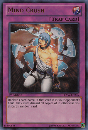 Mind Crush para mim SEMPRE foi uma carta foda! Mas vale a pena mesmo usa-lá se não for em um Dark World Deck? E além disso o outro problema é achar um espaço para colocar essa carta no Main ou Side Deck. Vou mostrar meu ponto de vista sobre ela e talvez você mude de idéia e arrume um espacinho para ela no seu Deck ( ou não kkk ).