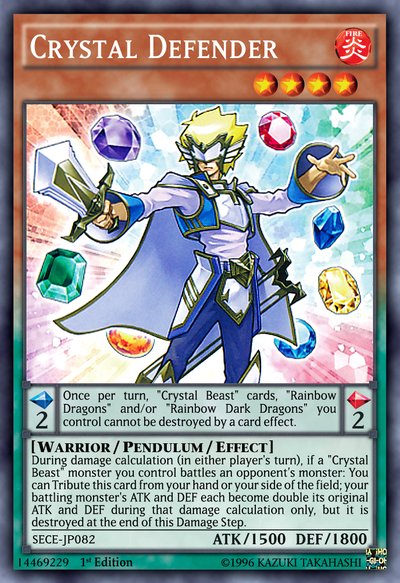 Crystal Defender- Enquanto pendulum , Crystal beasts cards e Rainbow dragons não podem ser destruídos por efeitos de cartas , como monstro tem o efeito de Bujin Crane , ele é bom e pode surpreender o oponente.