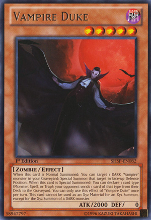 Exclusiva tcg vampire duke é uma versão invertida de Shadow vampire, ele permite caso seja invocado de forma normal invocar um vampiro do cemitério em modo de defesa, o monstro invocado não pode atacar e pelo efeito de shadow ele não pode atacar é bem o contrário mesmo. Seu efeito importante é o de mandar cartas do deck do oponente para o limbo combando então com vampire kingdom e principalmente é mais um card que vai devastar o deck do adversário. Esse card sendo invocado com Shadow Vampire já é possível mandar um card do deck do oponente e se Grace estiver no cemitério são 2 cards. Não tive a oportunidade de testar uma decklist com um método para apenas destruir cards especificos do deck do oponente então quem tiver intersse de testar sinta-se a vontade para postar a decklist aqui mais tarde.