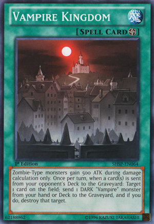Assim como todo campo da nova geração (dragon ravine, grand spellbook tower, ghostrick house) Vampire kingdom não deixa a desejar. É essencial no deck e principalmente para os melhores combos do mesmo. Seu primeiro efeito faz todos os monstros zumbi (detalhe para zumbi e não vampiro, ou seja mezuki, zombie master e goblin zombie também se beneficiam do efeito) ganharem 500 de atk na damage step, este é outro fator importante pois muita gente vai esquecer quando atacar e de brinde não afeta jogadas situacionais como levar um magic cilynder ou goblin zombi e turtle cairem em bottomless por exemplo. Este card deixa vampire bram com 3000 atk e todos os outros vampiros com 2500 fazendo todos serem máquinas de matar, exceto edward porque ele é um cuzão.