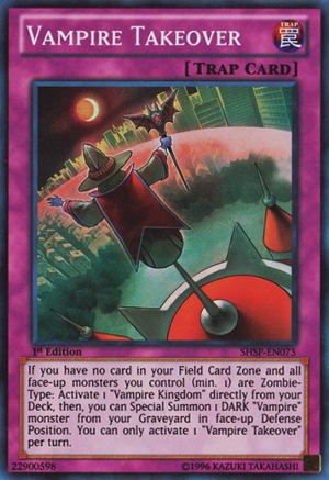 Única trap do tema vampire takeover é uma fusão de recruiter com swarm e principalmente por ser uma trap pode pegar o oponente desprevinído. Ela permite caso você controle um zumbi (não apenas vampiro) ativar um Vampire kingdom diretamente de seu deck e de brinde invocar um vampiro do cemitério. Na fase final esse card é incrível pois já te deixa com 2 monstros em jogo e o campo pronto para destruir seu oponente, ele ainda pode ser ativado em corrente a algum efeito que mande cards na vez do oponente fazendo ele perder uma carta do campo instantaneamente.