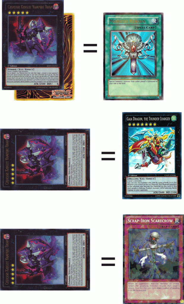 Tá ai a imortalidade em pessoa, Vampire bram sempre que for destruído pelo oponente vai voltar na próxima standby criando presença de campo sempre. Porém este efeito tem um problema sério pois ele entra em defesa, ou seja, se ele for destruído na vez do oponente ele irá retornar em defesa na sua vez e você não vai poder atacar com ele, uma pena mesmo. Mas eis que entra Gaia the thunder charger para arregaçar essa festa, colocando ele em cima de Vampire bram você terá acesso ao poder de ataque que precisa e de graça visto que o oponente teve que gastar recursos para tirar Bram de jogo mas ele voltou mesmo assim.