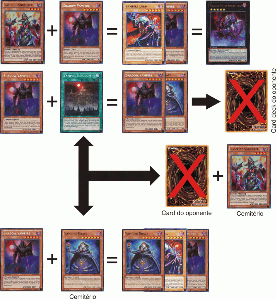 Começando com a alma do deck, vampire sorcerer é o card que você sempre vai querer estar em jogo. Quando ele for enviado para o cemitério pelo oponente você pode adicionar qualquer carta que tenha vampiro no nome, ou seja tudo, monstro, magica ou armadilha. Cartas importantes como vampire kingdom são facilmente buscados com este card dando velocidade ao deck. Seu segundo efeito é quase mais importante pois removendo ele do cemitério é possível invocar um vampiro sem pagar nenhum tributo então aquele lord vampiro de 5 estrelas entra de graça com o efeito deste carinha. Mas isso não é tudo pois no card diz sem tributo e não 1 a menos por isso ainda estou no aguardo de um vampiro de level 7 ou maior para entrar pelo efeito dele, vai ser um absurdo.
