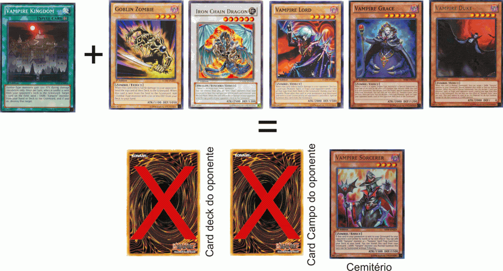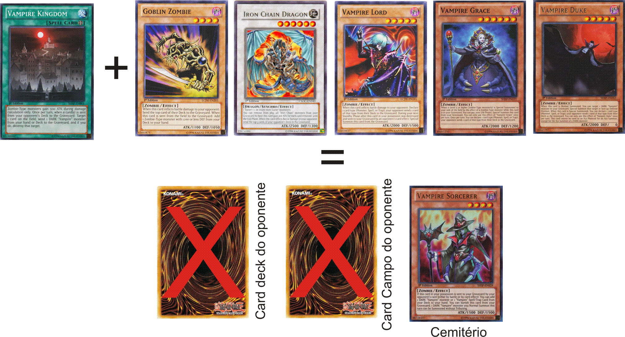 Para finalizar se seu oponente mandar alguma carta do deck para o cemitério na vez dele o efeito de Vampire Kingdom também se ativará, cards como foolish burial, tidal, card trooper, ficam problemáticos para o oponente usar enquanto Kingdom está em campo. Outro card legal para testar é gravekeepers Servant fazendo o oponente ser obrigado a mandar um card do topo para atacar ativará Vampire kingdom também.