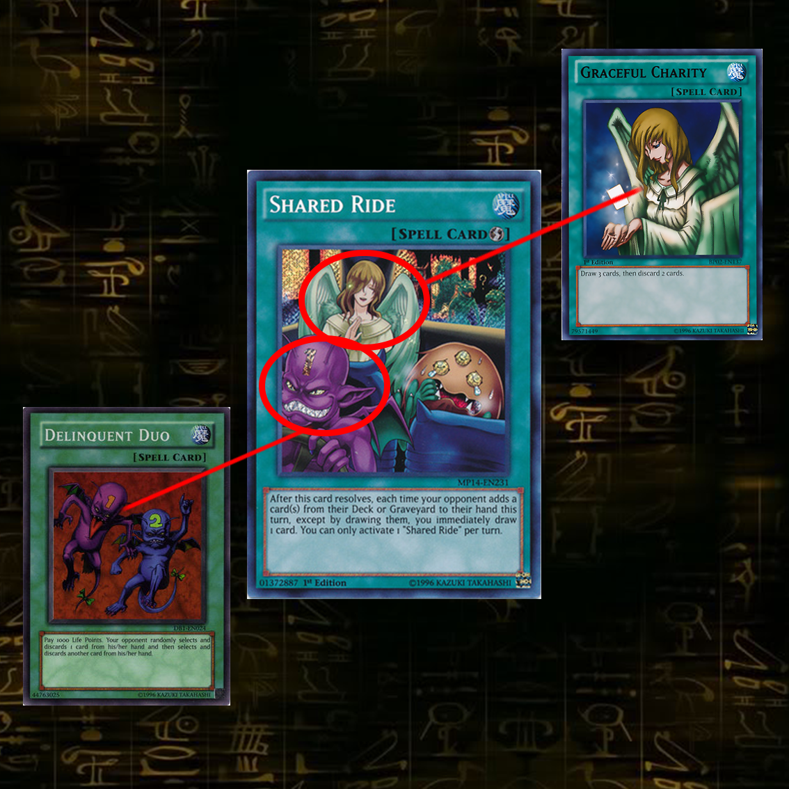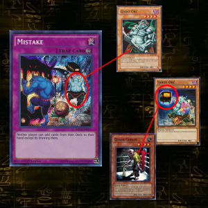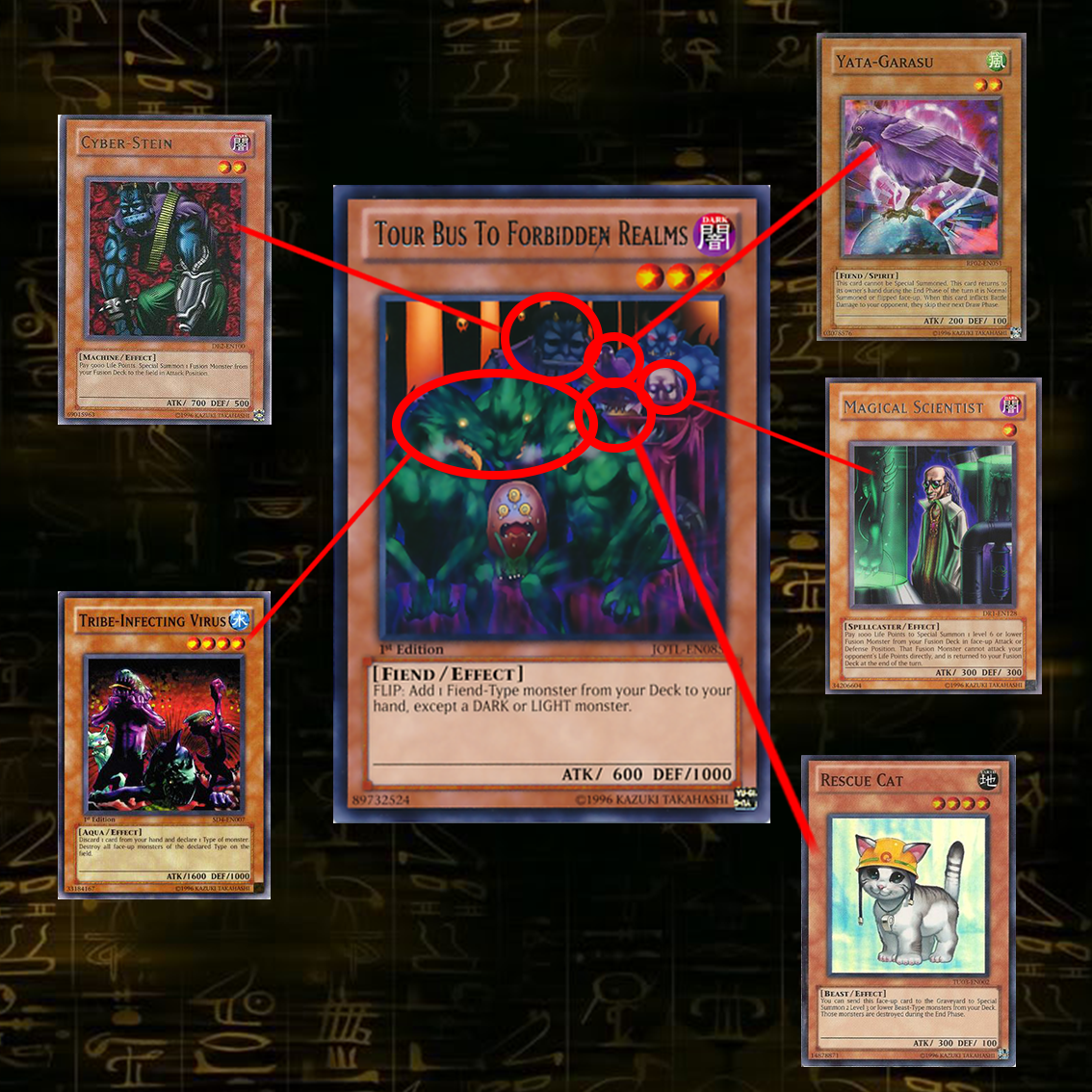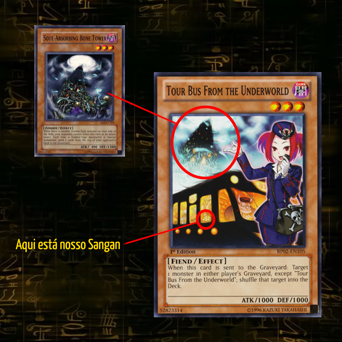 Nota: Essa carta tem uma série de curiosidades. Primeira: todos os monstros estão banidos. O menos perceptível é o Rescue Cat, que aparece apenas um pedacinho do capacete e as orelhas. Segunda: O monstro azul lá trás é o mesmo que está entrando no ônibus em Mistake. Terceira: Essa carta tem o mesmo level, tipo e atributo do Sangan e das cartas presentes na imagem, só busca o Yata.