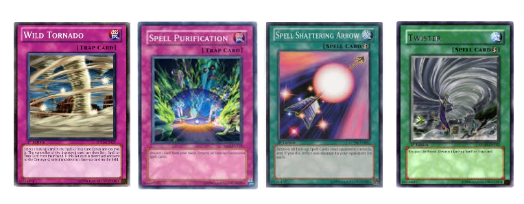Mas já que destruir uma carta continua é quase igual a nega-la, as opções crescem e se tornam melhores.Primeiramente, não vou citar MST, já que é uma carta essencial em main decks. Alem do MST, temos a já famosa e muito utilizada Dust Tornado temos uma variedade de opções. Já que o deck Fire Fist usa muito Backrow uma opção é Tornado que tem a mesma utilidade de MST, mas só pode ser usada se o oponente possui mais de 3 Spell/Trap. Outra opção para destruir as Fire Formations é Twister. Uma boa opção também, bem versátil diga-se de passagem, é Wild Tornado. Para os que não sabem , ela é uma opção como Dust Tornado e apesar dela permitir seu oponente setar uma spell/trap no lugar da carta que foi destruída, caso ela seja destruída você pode inclusive se livrar de um monstro problemático como um Bear. Mais uma carta muito utilizada nos sides dos campeonatos por ai, é Chain Whirlwind, uma carta muito boa, que eu recomendo muito. Finalmente, as duas cartas que eu julgo serem as melhores: A primeira é Spell Purification, que ao custo de um descarte, destrói todas as magias continuas no campo. Por fim, aquela que ao meu ver é a melhor delas: Spell Shattering Arrow. Alem de ser quick-play e destruir todas as magias face-up no campo sem custo nenhum, ela ainda CAUSA 500 DE DANO PARA CADA CARTA DESTRUÍDA. Sem duvida muito efetiva.
