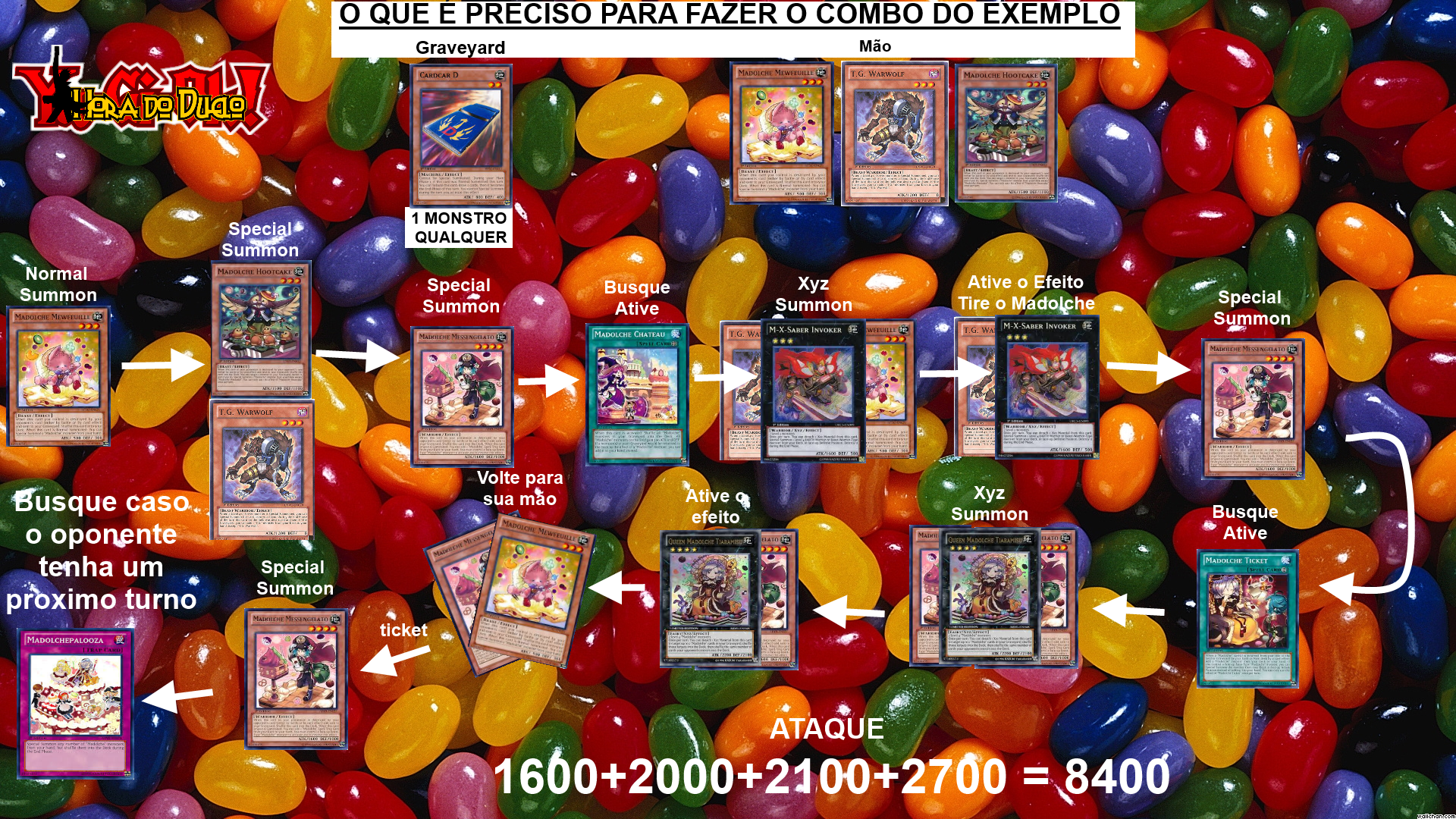 Em termos, a temática de doces dos Madoches é apropriada, já que eles focam em engordar a mão.O deck se foca em construir vantagem sobre o oponente. Como isso? simples. Vou usar como exemplo a seguinte jogada: O Jogador 1 tem em campo um "Elemental Hero Neos Alius". O jogador 2 invoca "Madolche Magileine" e busca um "Madolche Messengelato". Em seguida ele ativa "Madolche ticket" e "Madolche Chateau". Ele ataca o "Elemental Hero Neos Alius" com "Madolche Magileine" (que esta com 1900 graças ao campo) e ambos são destruidos. Com o Efeito do Chateau ele volta Magileine para a mão e com Ticket ele busca um "Madolche Mewfeuile". Se ambos, por exemplo tivessem iniciado o turno com 6 cartas na mão e nada no campo, agora o madolche player continua com 6 cartas na mão e tem agora 2 cartas no campo, enquanto o Hero player citado no exemplo estaria com 5 cartas na mão e nenhuma no campo. Com 2 searchs e Magileine destruindo Alius e voltando para mão, o madolche player do exemplo consegui um +3 sobre o oponente (somando campo e mão). Sabendo que essa vantagem é criada geralmente por Search e por reciclar os monstros para a mão. Temos então "Mistake" , "Deck Lockdown", "Droll and Lock Bird" e "Thunder King Rai-oh". Toda essa vantagem também pode ser um prato cheio para o já popular "Evilswarm Exciton Knight". Como essa vantagem depende, em grande parte, das duas spells citadas, cartas como "Dust Tornado", "Twister" , "Spell Shattering Arrow", "Chain Whirlwind", "Magic Deflector", "Eradicator Epidemic Virus" e qualquer outra carta que possa destruí-las. "Madolche Hootcake" tambem é fundamental, sendo quase um "Summoner Monk", então "Mirror of Oaths", também é uma opção.