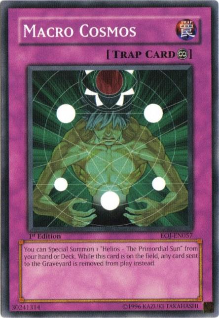 SDDS MACRO RABBIT! Ex-jogadores de rabbit lembram muito dessa carta, tanto dessa quanto da Dimensional Fissure, cartas que faziam com que o deck ficasse muito forte, na real, era por isso que tinha no nome do deck hahaha. O efeito da Macro Cosmos quando é ativada, é fazer Special Summon de um Helios - The Primordial Sun da mão ou do deck (se alguém alguma vez na vida utilizou esse efeito, por favor me comunique, você é uma raridade!) e o efeito continuo de qualquer carta que vá para o Grave seja banida. Sem choro!