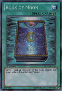 Book é semi-staple faz muito tempo. Seu efeito é bem simples, mas ao mesmo extremamente agradável. Ela pode parar um Synchro, xyz ou até mesmo ser usada para parar um ataque do oponente. Seu uso é 100% genérico, podendo ser usada em qualquer deck, desde o meta até o for fun. Seu preço e muito baixo também. Acho que não preciso falar mais dessa carta que todos os duelistas já devem conhecer.