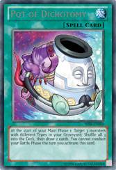 Ta ai o novo pot of avarice com seu efeito um pouco modificado. O novo pot faz você mandar 3 monstros de tipos diferentes para o deck deixando você comprar duas com a pegadinha de pular a fase de batalha. Decks que tem em seu tema varios tipos de monstros vão gostar muito da nova carta, como exemplo: evilswarms, constellars, Gbs, wind-up podem colocar cópias deste card ou até mesmo deck que tenham temática podem ter uma cópia deste card se eles estiverem usando cards como veiler e maxx c que atualmente são staples.