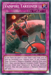 Vampire takeover é uma carta que chamou a atenção visto que é a única(pelo que conheço) que pode ativar um campo na vez do oponente. Seu efeito é muito foda visto que se você ativa-la na declaração de ataque seu oponente vai se deparar com um monstro com mais 500 de ataque durante o cálculo de dano sendo assim um mini shrink(caso não invoque o vampiro pelo segundo efeito). O card também já acelera o deck trazendo o campo diretamente para jogo e de brinde traz um vampiro do cemitério. O legal é que diz no card que se você não controla um campo, então se seu oponente controlar um ele vai sair de jogo para a entrada de vampire kingdom gerando um plus ainda maior. O mais importante do card é usa-lo na end do oponente gerando vantagem no momento que ele não pode mais contra atacar.
