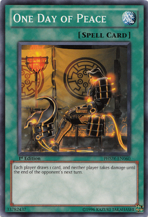One Day of Peace é uma carta que merece estar nesse Top pois seu fator de Trollagem só acontece no turno seguinte a que foi ativada. O oponente ativa, tudo tranquilo você fica feliz porque comprou uma carta, o problema é na sua vez, já que vc começa a fazer toda a jogada baixa lá seus 5 monstros e ataca e de repente...putz! One Day of Peace, ninguém leva dano até o próximo turno do oponente hahaha. Pode parecer idiota mas isso acontece.